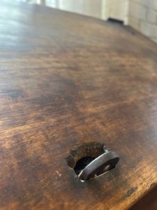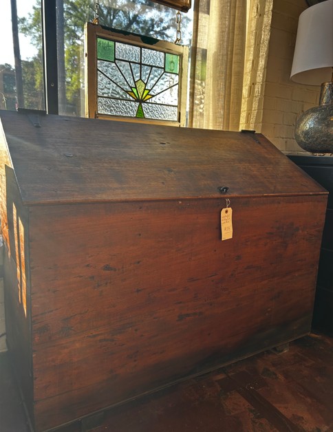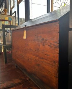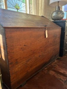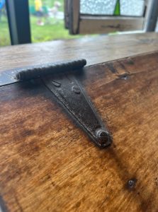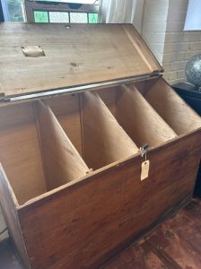 Old English divided grain bin. Oak with beautiful iron hardware. Wonderful rich patina. Deep with lots of room for storage.