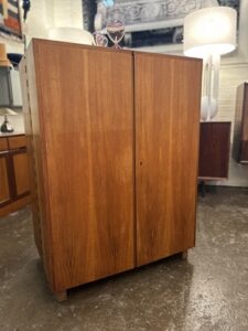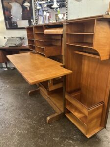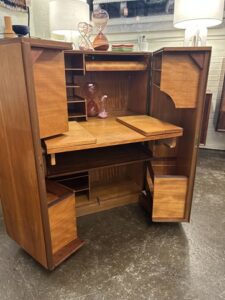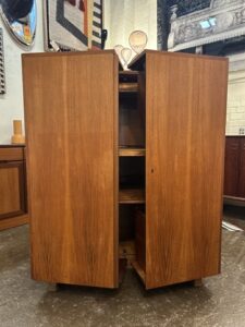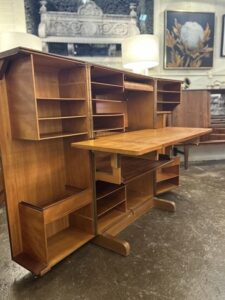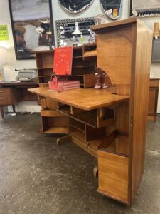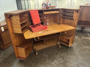 Work’s done, time to pack away the papers and pens, out of sight out of mind. It’s a desk in a box! Its fun, its functional, its just cool! Check out this beautiful mic century modern piece! This teak treasure is filled to the brim with shelves, cubbies, trays, and hinged platforms, compact but mighty, get’s the job done in style!