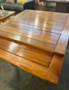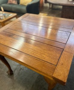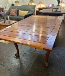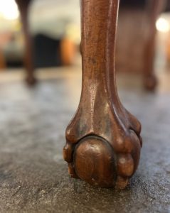 Unique carved claw foot oak pub table. Measures 35.5″ with 2 draw leaves each 12″ for a total length of 59″ when both extended. Great for small spaces with the option of entertaining, game nights, and more. Tons of old world charm and character. Sourced in England.